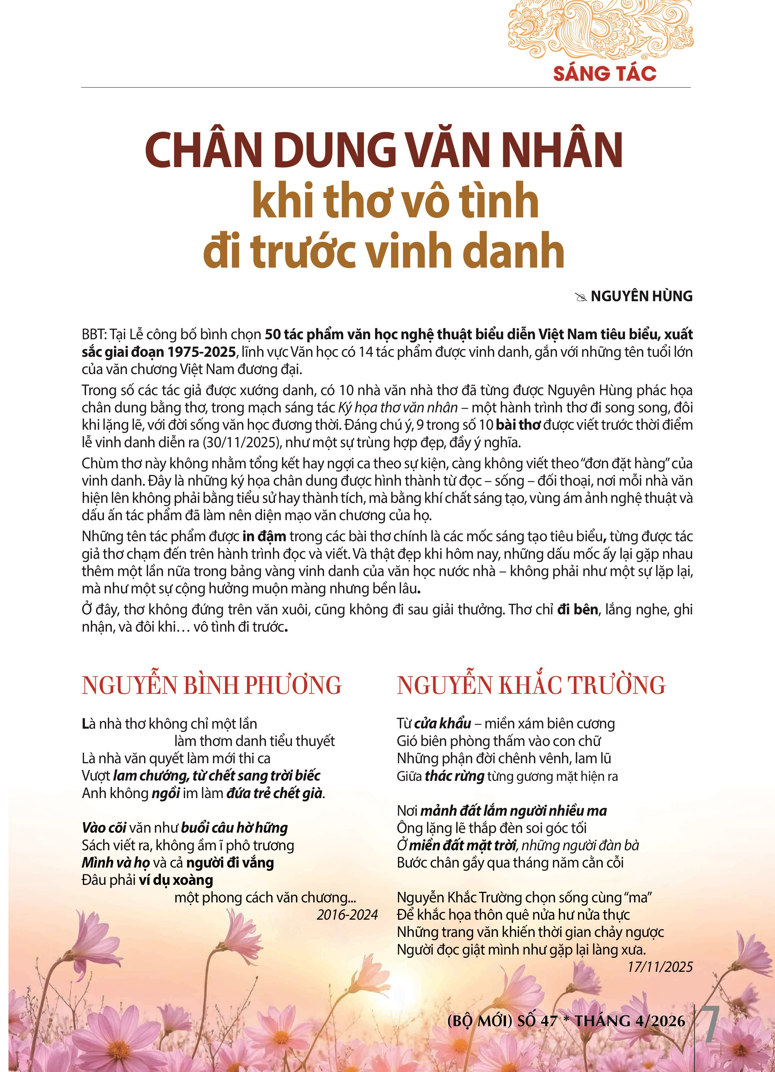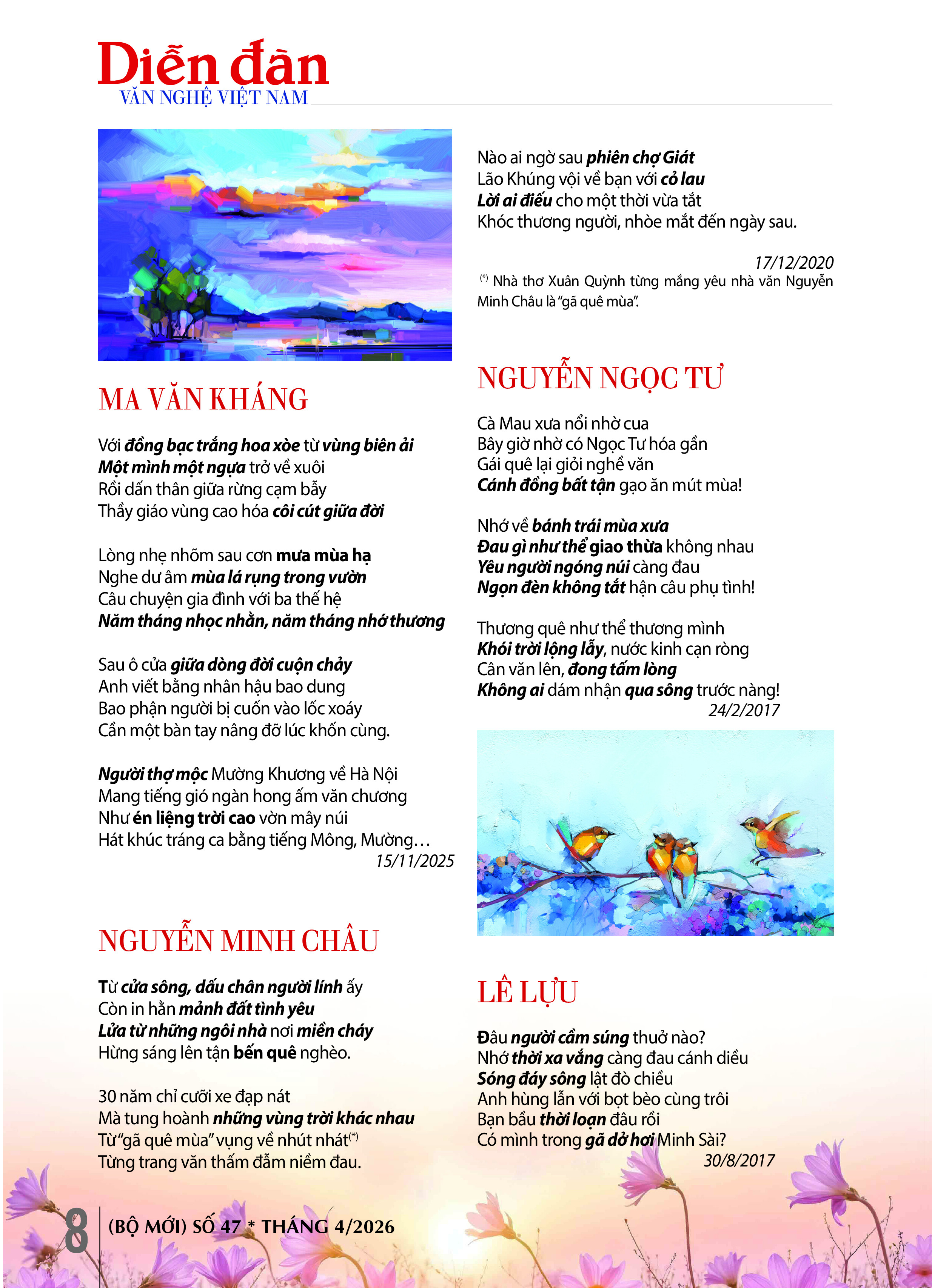 Chùm thơ này không nhằm tổng kết hay ngợi ca theo sự kiện, càng không viết theo “đơn đặt hàng” của vinh danh. Đây là những ký họa chân dung được hình thành từ đọc – sống – đối thoại, nơi mỗi nhà văn hiện lên không phải bằng tiểu sử hay thành tích, mà bằng khí chất sáng tạo, vùng ám ảnh nghệ thuật và dấu ấn tác phẩm đã làm nên diện mạo văn chương của họ.