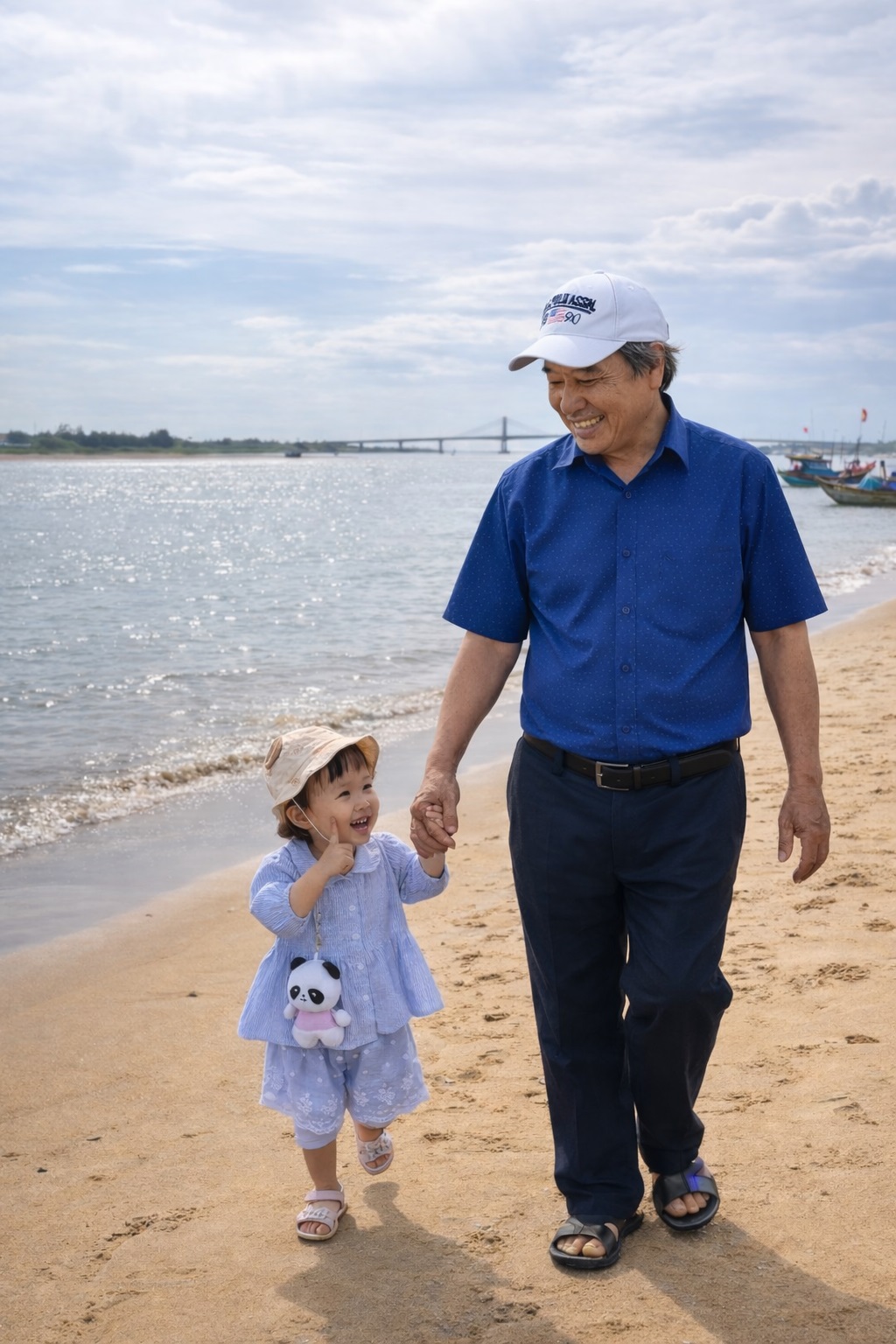Dắt bé đi trên bãi cát nhuốm vàng