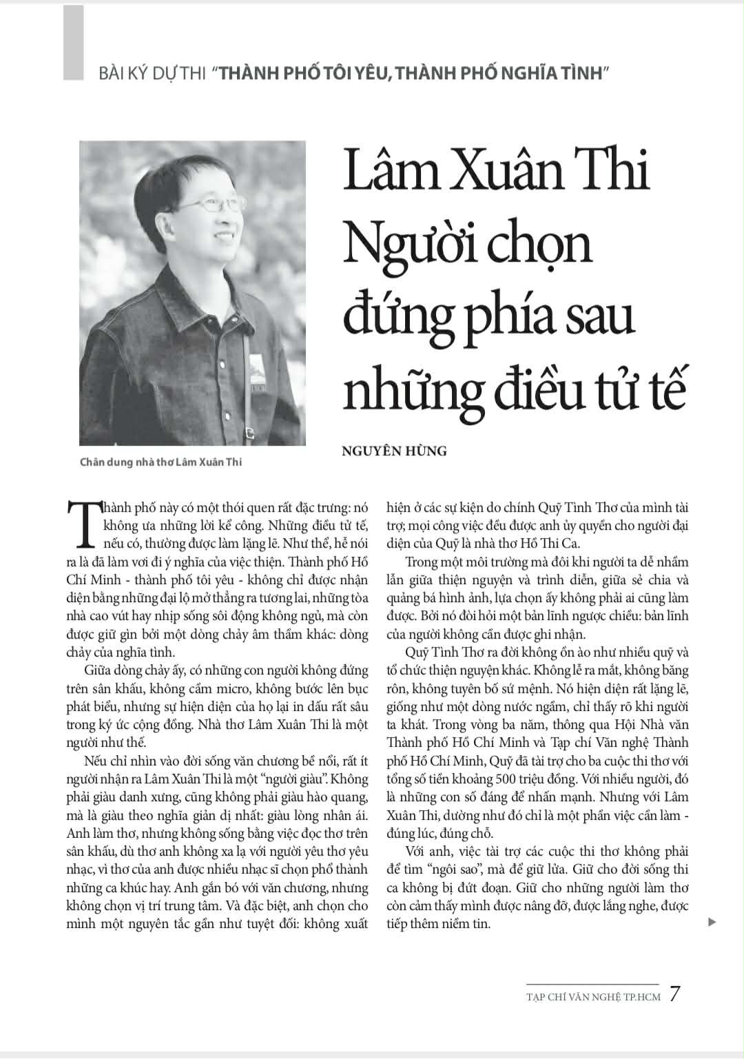 Thành phố Hồ Chí Minh có thể được gọi bằng nhiều mỹ danh: thành phố năng động, thành phố sáng tạo, thành phố đầu tàu kinh tế. Nhưng với tôi, sâu xa hơn, đó là thành phố nghĩa tình. Nghĩa tình không đến từ khẩu hiệu, mà từ những con người cụ thể, trong những hành động cụ thể, diễn ra không cần ánh sáng sân khấu. Nhà thơ Lâm Xuân Thi không đại diện cho một mô hình. Anh đại diện cho một phẩm chất Sài Gòn: làm việc tử tế như một lẽ tự nhiên, không cần được biết ơn, không cần được nhắc tên.