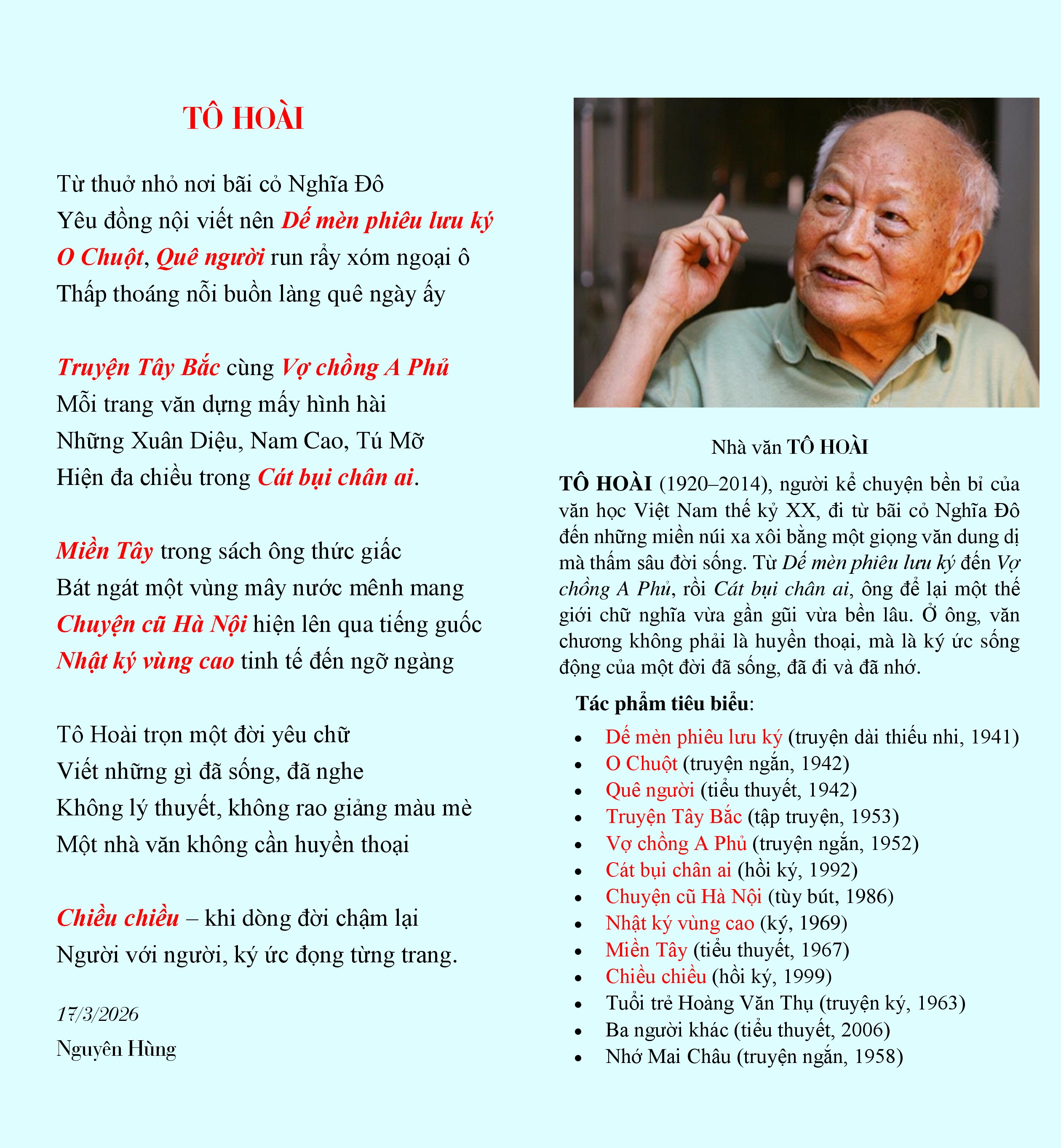 Nhân dịp kỷ niệm 106 năm ngày sinh của ông, xin chia sẻ bài ký họa thơ Tô Hoài - một cách đọc lại, một cách nhớ lại… và cũng là một cách tri ân.