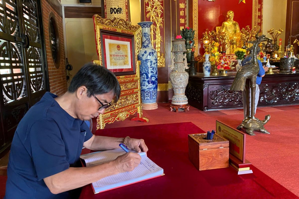 KTS Nguyễn Trường Lưu, Chủ tịch Liên hiệp các Hội Văn học Nghệ thuật TP. HCM ghi sổ lưu niệm tại Nhà tưởng niệm Chủ tịch Hồ Chí Minh (ATK Định Hóa) - Ảnh: Minh Phúc.