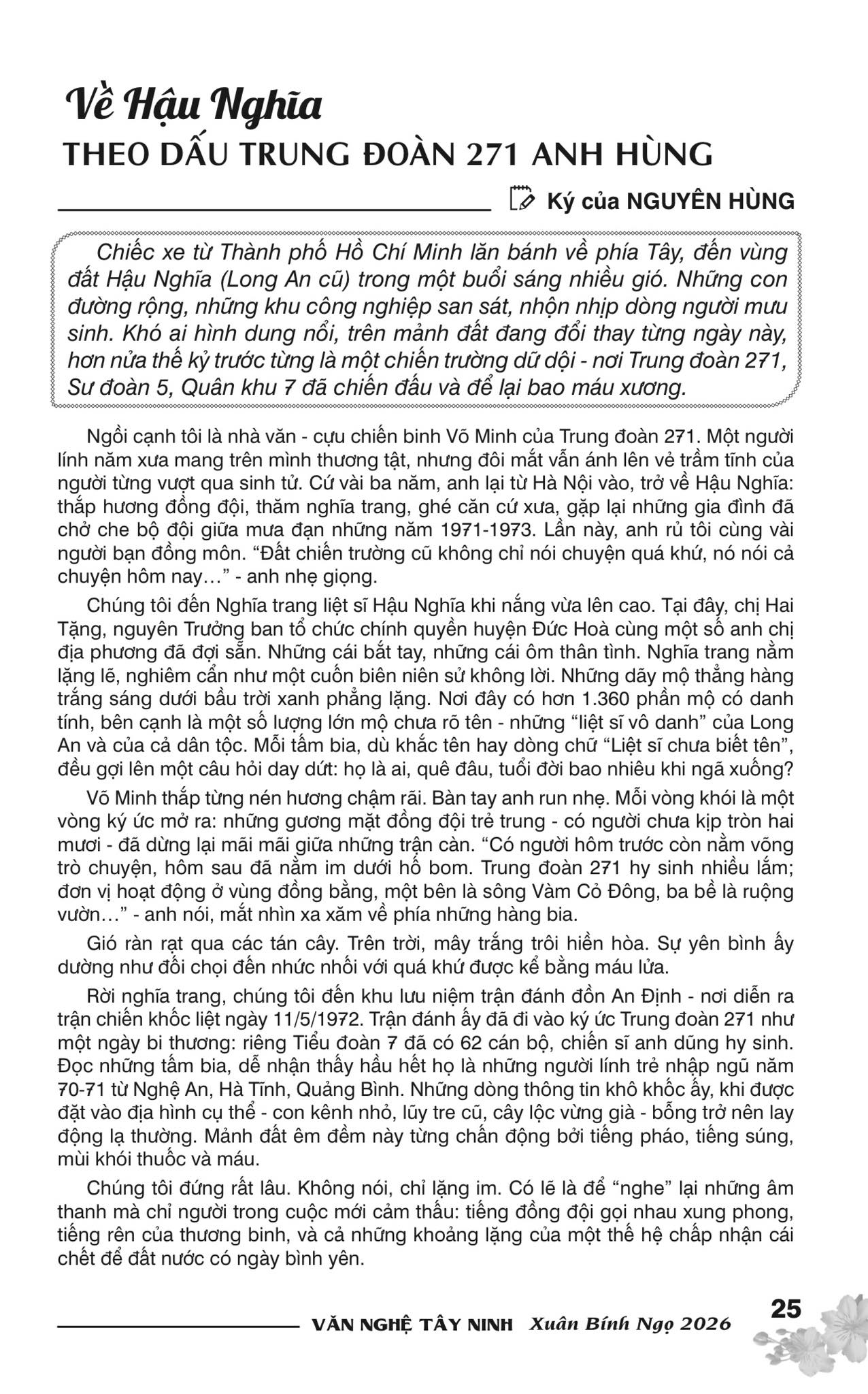 Ngồi cạnh tôi là nhà văn – cựu chiến binh Võ Minh của Trung đoàn 271. Một người lính năm xưa mang trên mình thương tật, nhưng đôi mắt vẫn ánh lên vẻ trầm tĩnh của người từng vượt qua sinh tử. Cứ vài ba năm, anh lại từ Hà Nội vào, trở về Đức Hòa: thắp hương đồng đội, thăm nghĩa trang, ghé căn cứ xưa, gặp lại những gia đình đã chở che bộ đội giữa mưa đạn những năm 1971-1973. Lần này, anh rủ tôi cùng vài người bạn đồng môn. “Đất chiến trường cũ không chỉ nói chuyện quá khứ, nó nói cả chuyện hôm nay…” – anh nhẹ giọng.