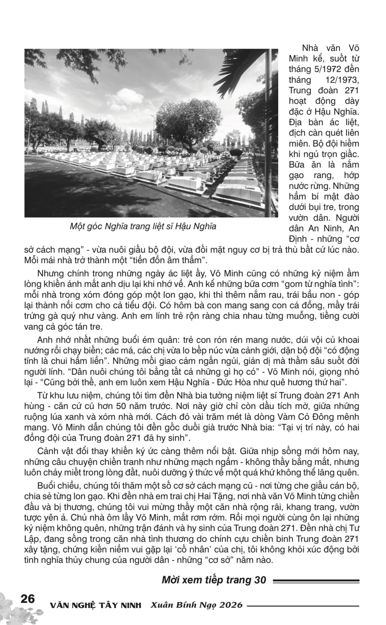 Nhà văn Võ Minh kể, suốt từ tháng 5/1972 đến tháng 12/1973, Trung đoàn 271 hoạt động dày đặc ở Đức Hòa. Địa bàn ác liệt, địch càn quét liên miên; đồng ruộng bằng phẳng mà tử khí dày đặc, bộ đội hiếm khi ngủ trọn giấc. Bữa ăn là nắm gạo rang, hớp nước rừng. Những hầm bí mật đào dưới bụi tre, trong vườn dân. Người dân An Ninh, An Thuận – những “cơ sở cách mạng” – vừa nuôi giấu bộ đội, vừa đối mặt nguy cơ bị trả thù bất cứ lúc nào. Mỗi mái nhà trở thành một “tiền đồn âm thầm”.
