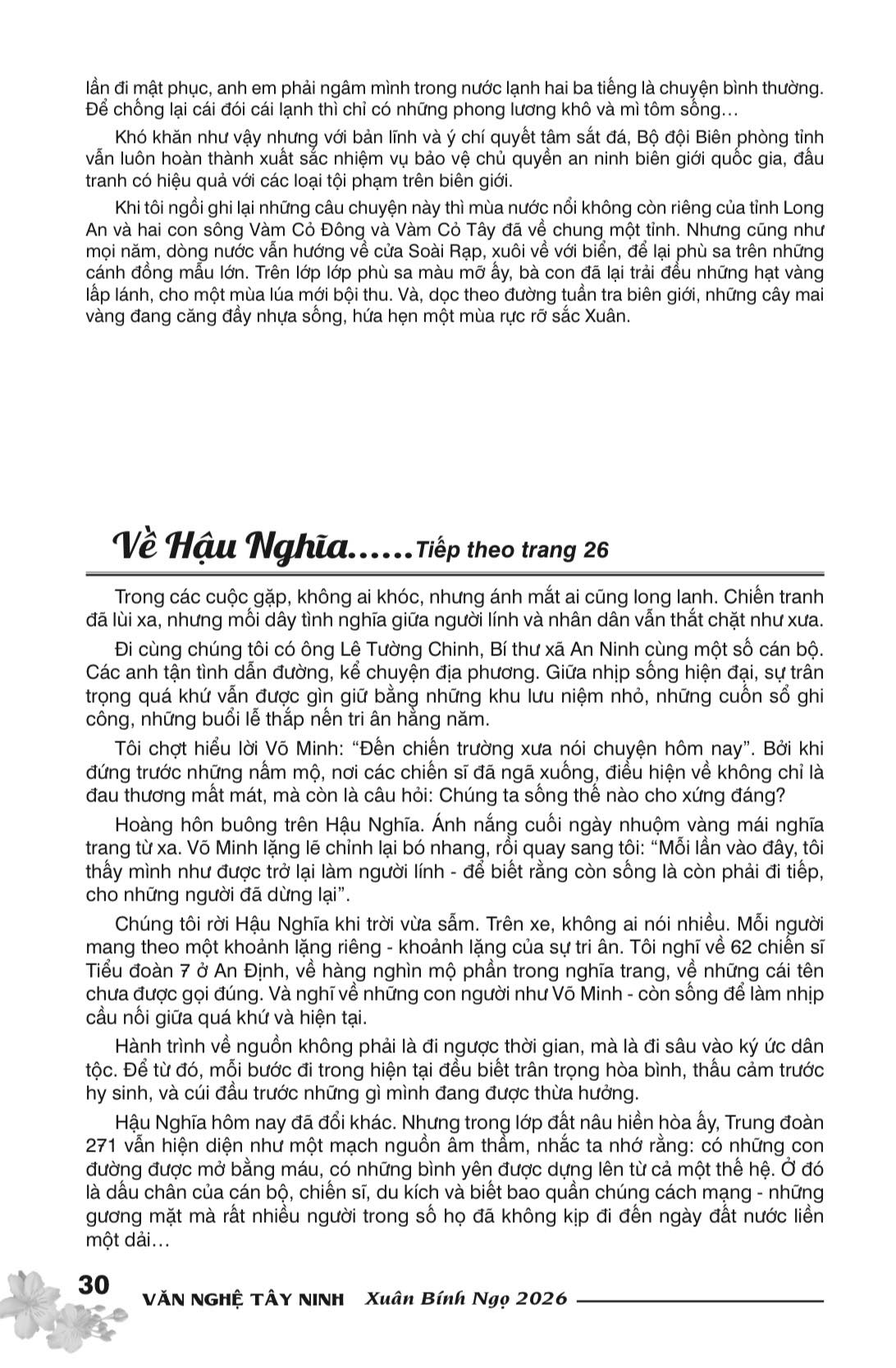 Chúng tôi rời Đức Hòa khi trời vừa sẫm chiều. Trên xe, không ai nói nhiều. Mỗi người mang theo một khoảnh lặng riêng – khoảnh lặng của sự tri ân. Tôi nghĩ về 62 chiến sĩ Tiểu đoàn 7 ở An Hiệp, về hàng nghìn mộ phần trong nghĩa trang, về những cái tên chưa được khắc chính xác. Và nghĩ về những con người như Võ Minh – còn sống để làm nhịp cầu nối giữa quá khứ và hiện tại.