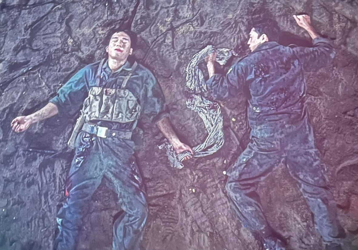 Cường nằm ngữa và Quang nằm sấp giữa họ là chiếc khăn rằn của Hồng rách làm đôi hình chữ S biểu tượng cho đất nước bị chia cắt.