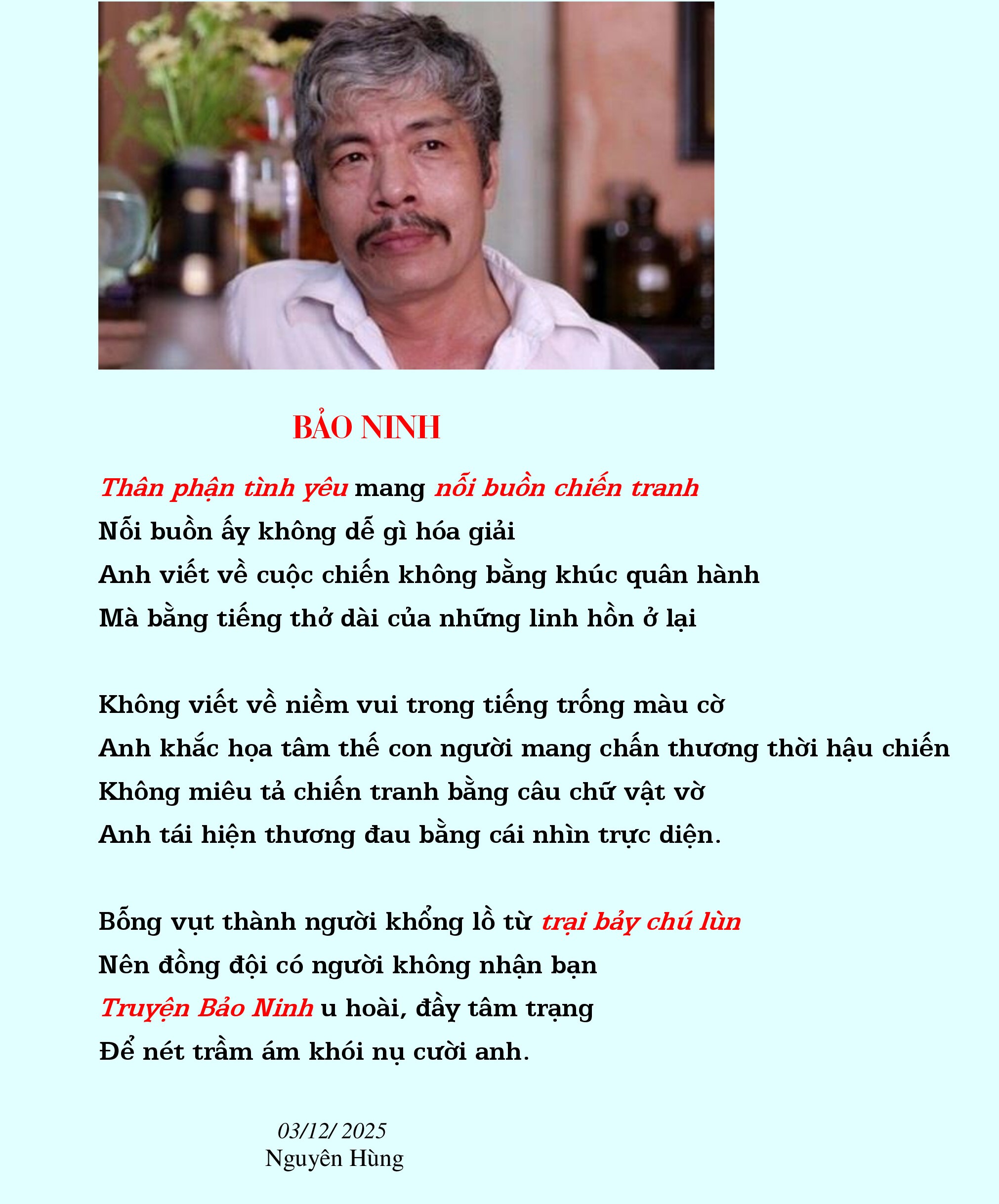 Đặt bài thơ “Không việc gì phải lắm lời” của Nguyễn Khoa Điềm cạnh những tranh luận xoay quanh “Nỗi buồn chiến tranh” của Bảo Ninh, có thể thấy rõ hơn một điểm chung quan trọng: văn chương đích thực luôn chống lại sự đơn giản hóa chiến tranh. Một bên viết từ bên trong nỗi đau và ám ảnh của người lính trở về; một bên lên tiếng từ độ lùi của thời gian và trải nghiệm lịch sử. Cả hai đều không chạy theo nhu cầu an ủi đạo đức dễ dãi, càng không chấp nhận việc ký ức chiến tranh bị lôi ra xét xử bằng những tiêu chí phi văn học.
