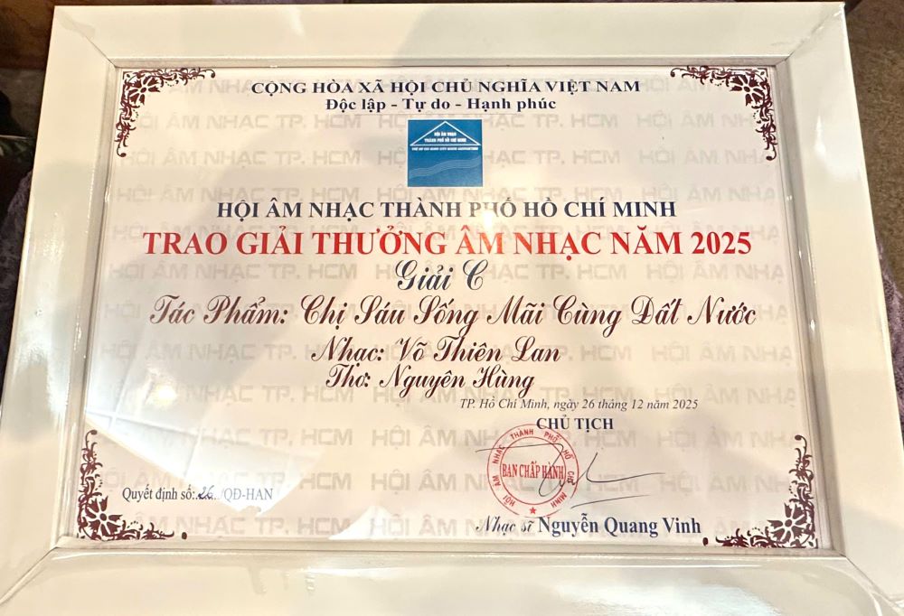 Xin được chia sẻ một niềm vui nho nhỏ: ca khúc “Chị Sáu sống mãi cùng Đất Nước” (thơ Nguyên Hùng, nhạc NS–NSƯT Võ Thiên Lan) vừa được Hội Âm nhạc TP. Hồ Chí Minh trao Giải C năm 2025.
