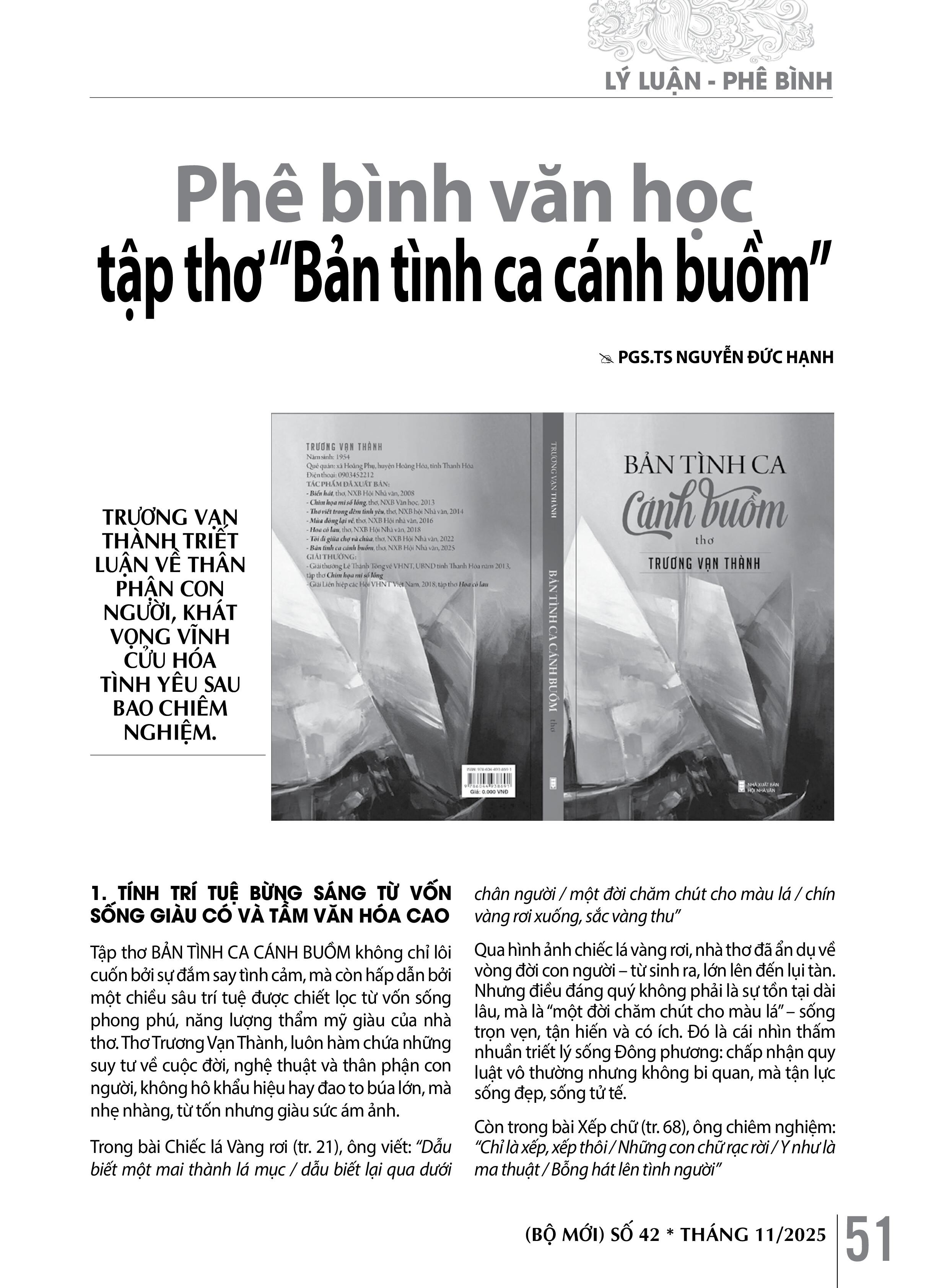 Tập thơ “BẢN TÌNH CA CÁNH BUỒM” không chỉ lôi cuốn bởi sự đắm say tình cảm, mà còn hấp dẫn bởi chiều sâu trí tuệ được chiết lọc từ vốn sống phong phú và năng lượng thẩm mỹ giàu có của nhà thơ. Thơ Trương Vạn Thành luôn hàm chứa những suy tư về cuộc đời, nghệ thuật và thân phận con người, không hô khẩu hiệu hay đao to búa lớn, mà nhẹ nhàng, từ tốn nhưng giàu sức ám ảnh.