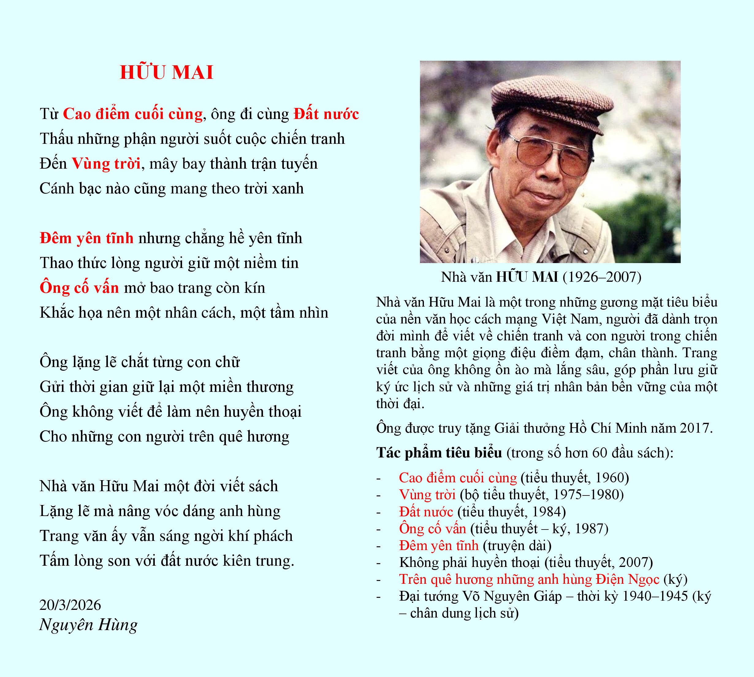 Nhà văn Hữu Mai (1926–2007) là một trong những gương mặt tiêu biểu của nền văn học cách mạng Việt Nam, người đã dành trọn đời mình để viết về chiến tranh và con người trong chiến tranh bằng một giọng điệu điềm đạm, chân thành. Trang viết của ông không ồn ào mà lắng sâu, góp phần lưu giữ ký ức lịch sử và những giá trị nhân bản bền vững của một thời đại.