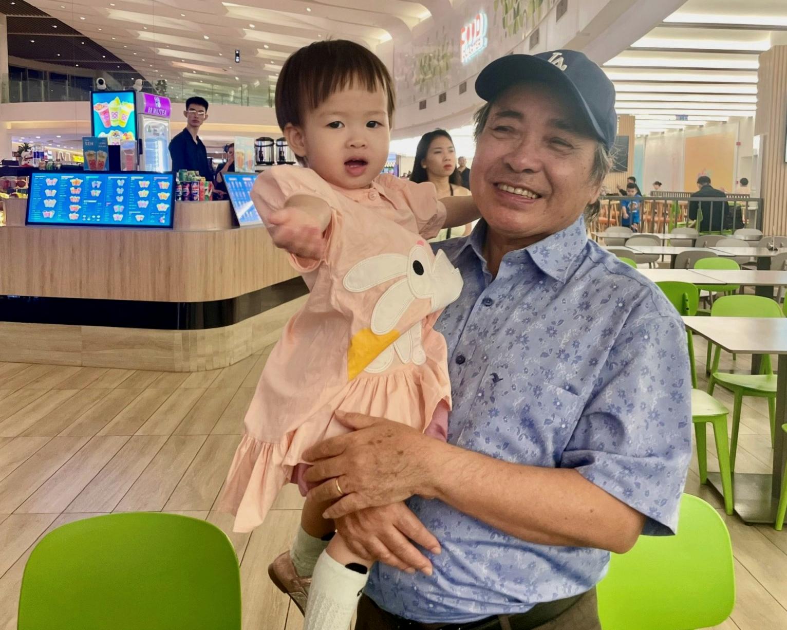 3 cháu nội: Tuệ Chi (áp vai trái ông), Mai An (bên phải, hàng đầu), Hoàng Đan (bên trái, hàng đầu).