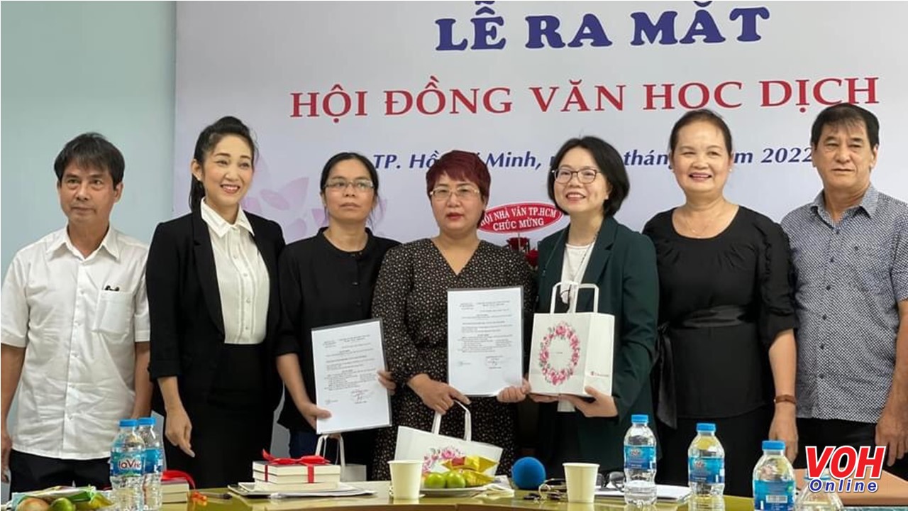 Nhà thơ Hồ Thi Ca (bìa phải) thay mặt Quỹ Tình thơ trao quà cho Hội đồng Văn học dịch – Hội Nhà văn TPHCM vừa được thành lập - Ảnh: Phương Huyền.