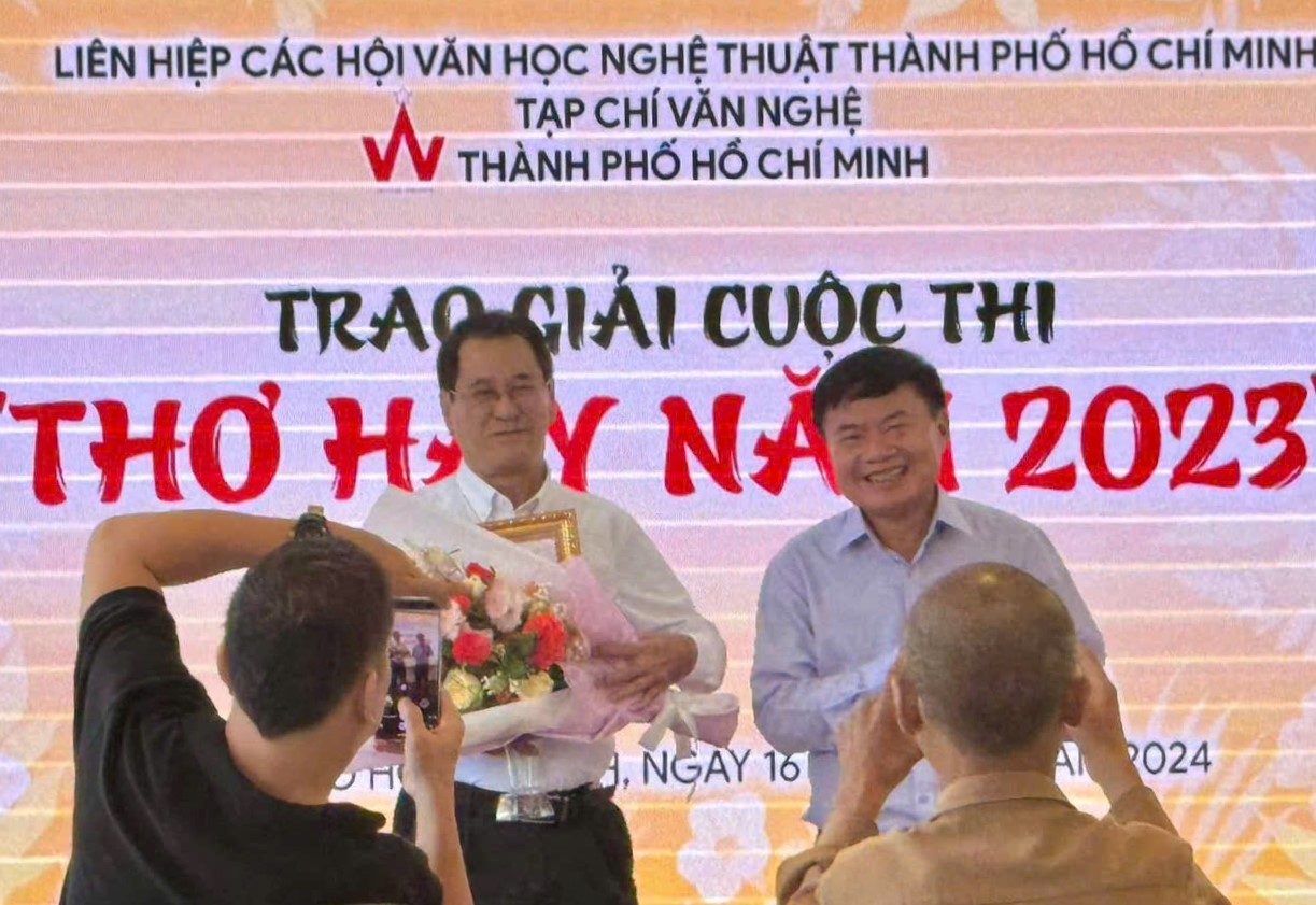 Nhà thơ Hồ Thi Ca được nhà thơ Lâm Xuân Thi uỷ quyền làm đại diện Quỹ Tình Thơ tại Lễ trao giải Cuộc thi Thơ Hay 2023 do Tạp chí Văn Nghệ TPHCM tổ chức - Ảnh: Hồ Thi Ca.