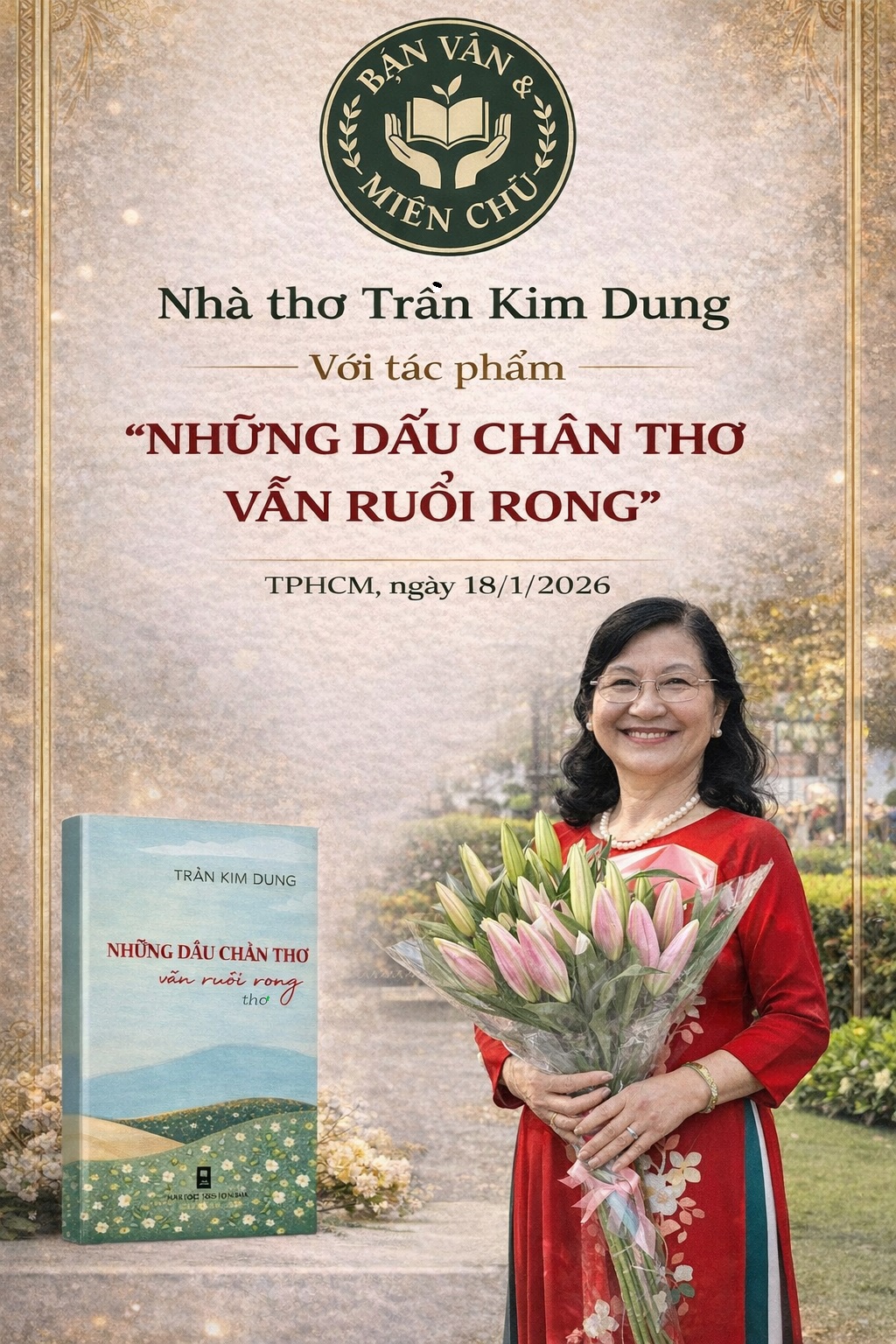 “Những dấu chân thơ vẫn ruổi rong” của nhà thơ Trần Kim Dung sẽ được Nhóm Bạn văn & Miền chữ tổ chức ra mắt vào sáng 18/1/2026.