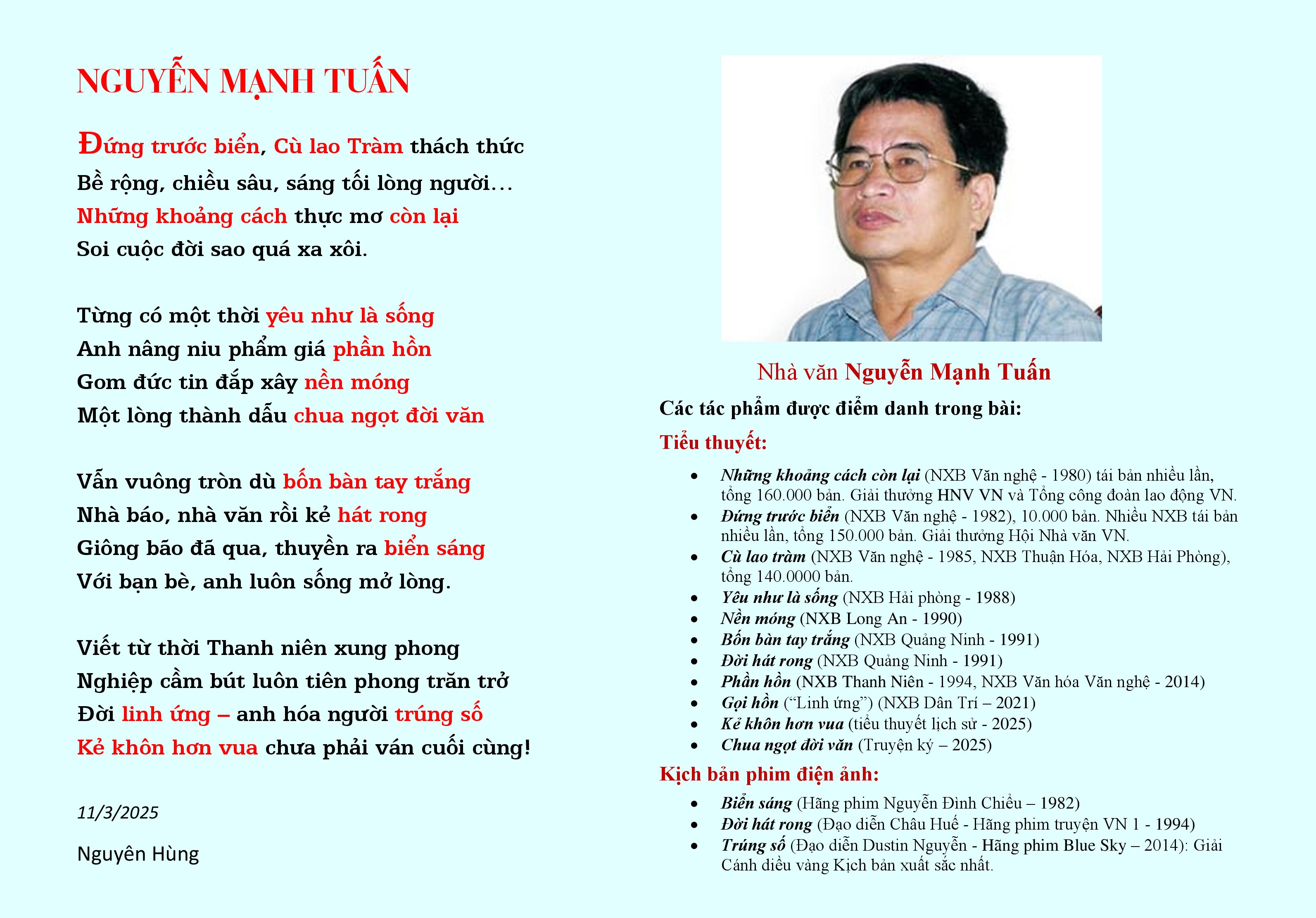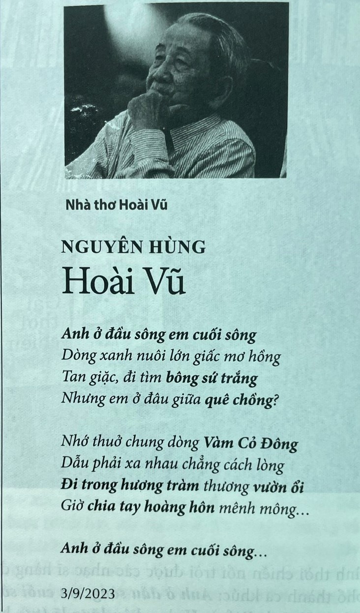 Đến dự buổi họp mặt với tư cách khách mời và cũng là một người viết thuộc thế hệ sau, nhà thơ Nguyên Hùng đã góp vui bằng hai bài thơ ký họa chân dung dành cho nhà thơ Hoài Vũ và nhà văn Nguyễn Mạnh Tuấn. Những câu thơ ngắn gọn, dung dị, vừa mang tính khắc họa, vừa như một lời tri ân: