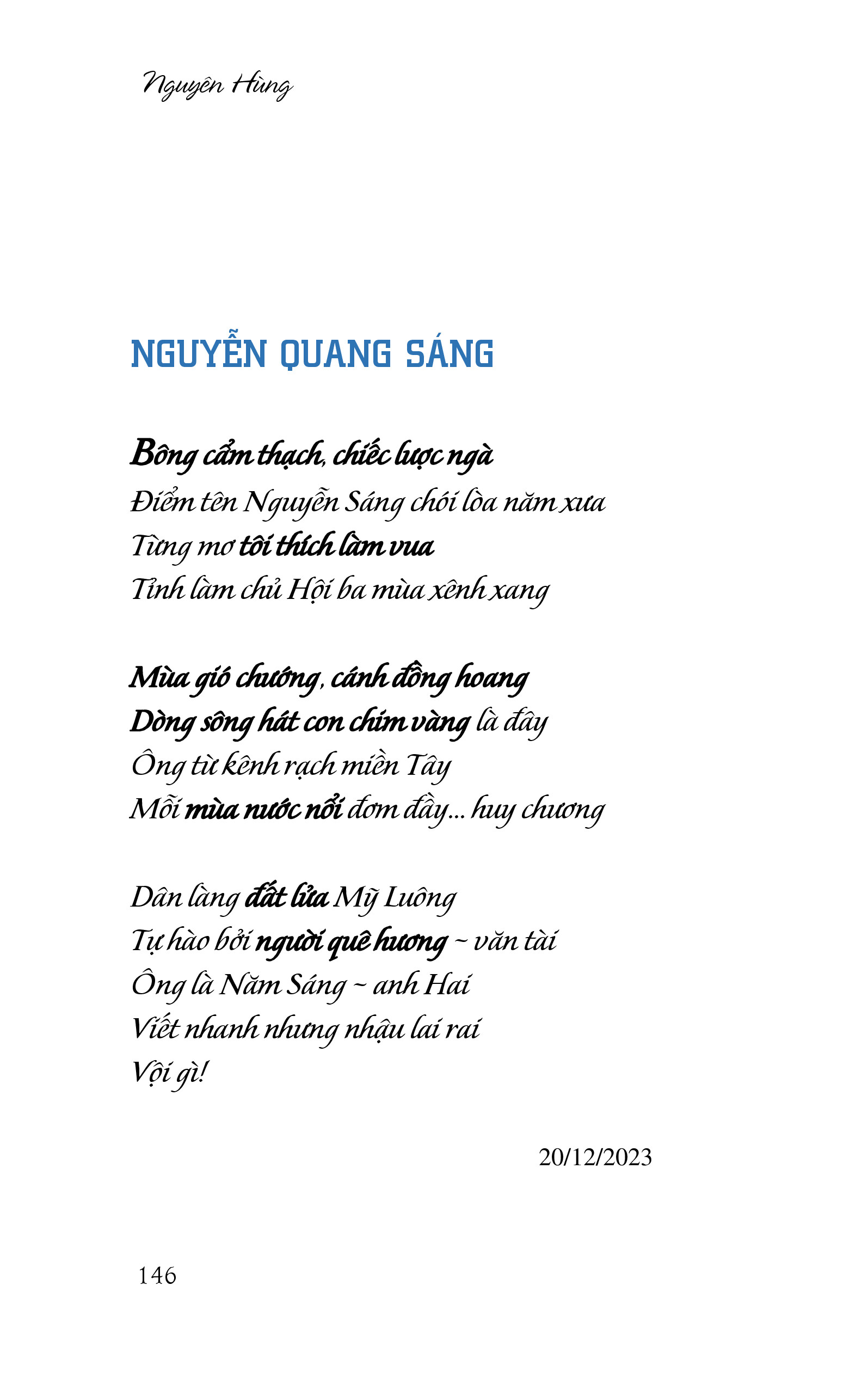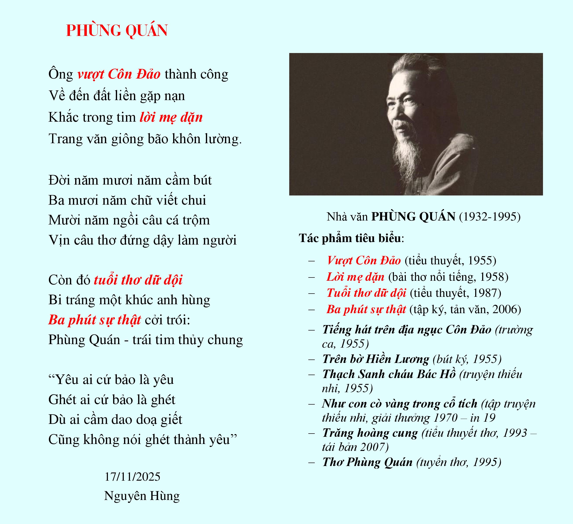 Mỗi độ bước sang năm mới, tôi thường có thói quen trở lại với những gương mặt văn chương đã đi xa. Với chùm Ký họa thơ tháng Giêng, tôi chọn giới thiệu ba nhà văn được sinh trong tháng đầu năm và đều đã qua đời: Phùng Quán, Nguyễn Quang Sáng, Khuất Quang Thụy. Ba con người, ba số phận, ba cách đi qua văn chương rất khác nhau, nhưng gặp nhau ở một điểm chung: chữ nghĩa của họ được viết ra từ đời sống thật, từ trải nghiệm thật, và từ một trách nhiệm không né tránh với sự thật.