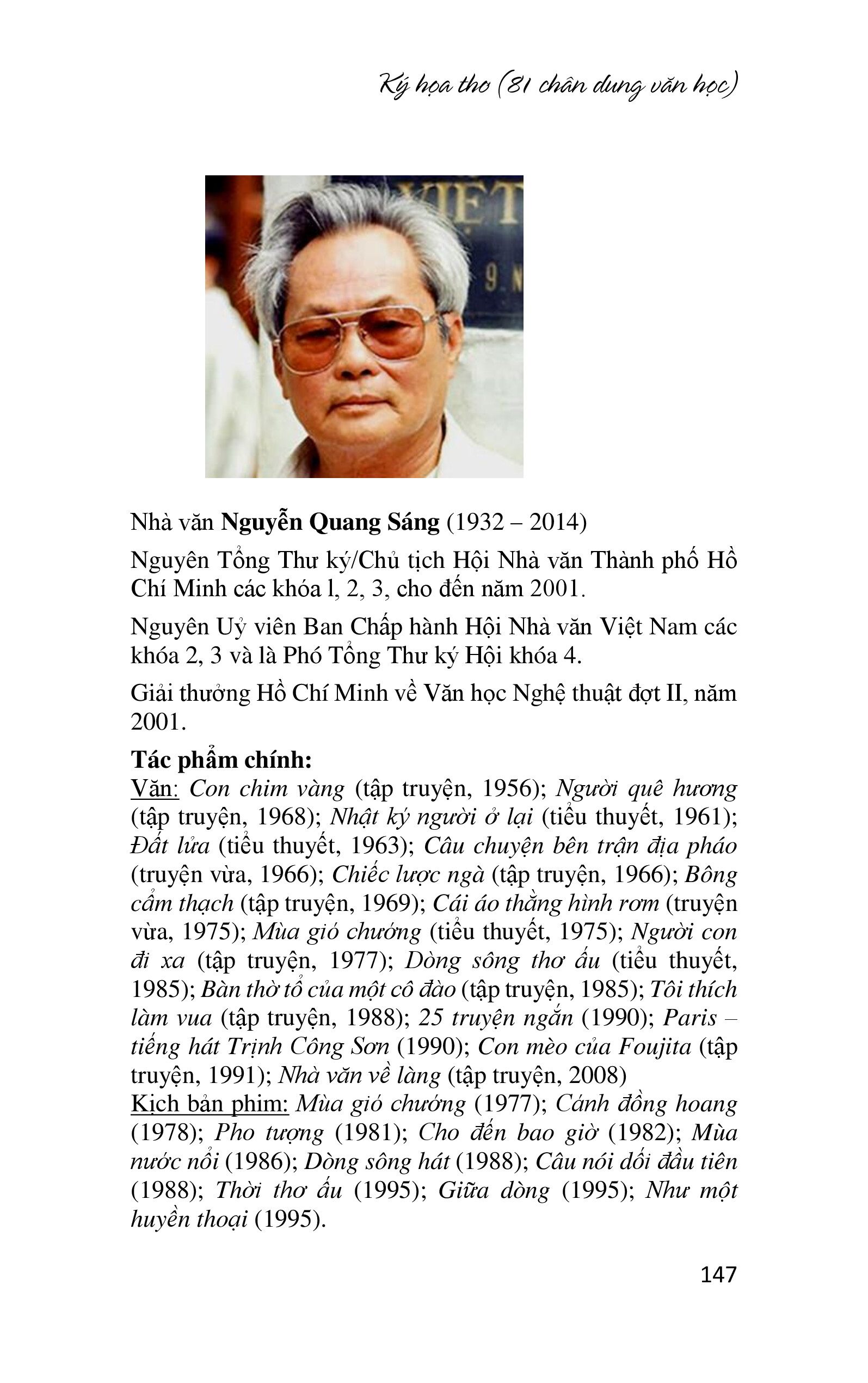 Viết những ký họa này, tôi không có tham vọng khái quát toàn bộ chân dung hay sự nghiệp của các nhà văn, mà chỉ chọn vài nét chính – những nét mà theo tôi, đã làm nên phẩm chất người cầm bút ở họ. Bởi khi người viết đã đi qua đời sống, điều còn lại không phải là năm sinh hay năm mất, mà là cách họ đã sống với chữ, và đã để chữ sống thế nào trong lòng người đọc.