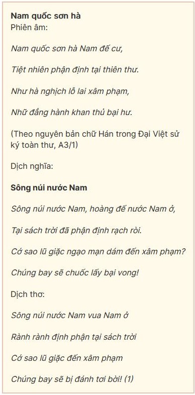 Có thể khẳng định, Nam quốc sơn hà chắc chắn được ra đời vào thời kỳ đầu khi nền độc lập, tự chủ của dân tộc Việt còn đang trứng nước và đứng trước thử thách lớn lao, trước các cuộc chiến tranh xâm lược của phong kiến phương Bắc. Do phải thực hiện một vai trò vô cùng đặc biệt mang tính chất tâm linh, tín ngưỡng, phục vụ cho công cuộc bảo vệ và gìn giữ nền độc lập non trẻ của dân tộc, bài thơ không lưu tên tác giả, được gán cho thần linh và lưu truyền như một tác phẩm dân gian. Bài thơ có nội dung và giá trị nghệ thuật vô cùng lớn lao, được coi như bản Tuyên ngôn độc lập đầu tiên của dân tộc Việt Nam, mở đầu cho một thời kỳ phát triển trong độc lập, tự do của đất nước.